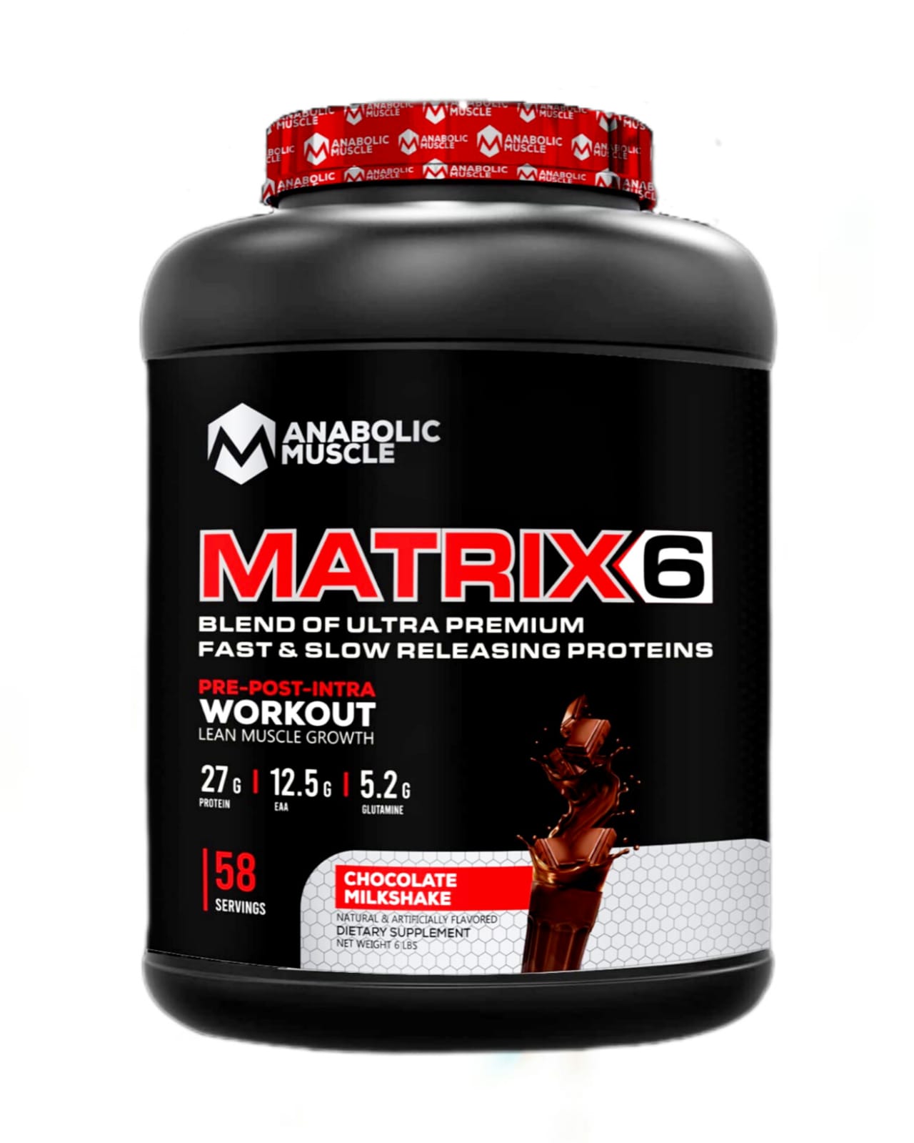 Anabolic Muscle Matrix 6 is a high-quality protein supplement made with a blend of fast and slow releasing proteins. It is suitable for pre, post, and intra workout use, helping in lean muscle growth and recovery. Each serving provides 27g protein, 12.5g EAA, and 5.2g glutamine. The supplement supports continuous amino acid release to the muscles for better strength and performance. It comes in a chocolate milkshake flavor and contains 58 servings. Recommended for athletes, bodybuilders, and fitness enthusiasts looking to improve muscle recovery and overall results.