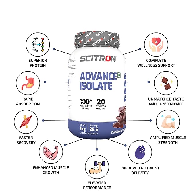 - Lactose Friendly, Happy Gut:Scitron Advance Whey Protein Isolate 1kg chocolate flavour is a low-lactose form of whey protein, making it easier to digest and gentler on your stomach. Now you can enjoy the benefits of protein without the discomfort.